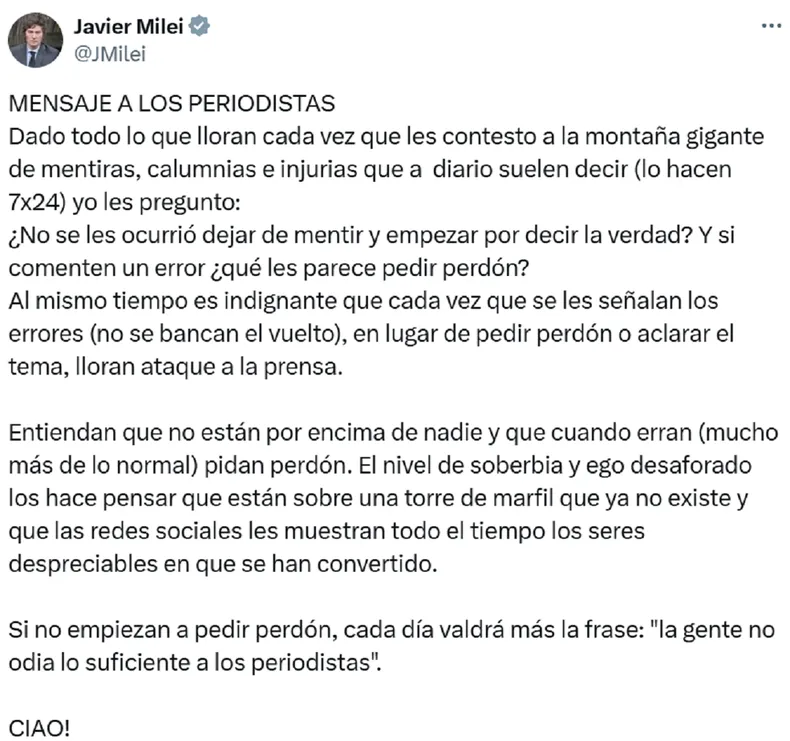 En una publicación en su cuenta de la red social X, Milei apuntó hacia los periodistas debido al contenido de la información que exponen: «Dado todo lo que lloran cada vez que les contesto a la montaña gigante de mentiras, calumnias e injurias que a diario suelen decir (lo hacen 7×24) yo les pregunto: ¿No se les ocurrió dejar de mentir y empezar por decir la verdad?»