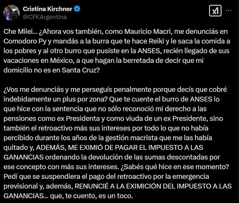 «Che Milei… ¿Ahora vos también, como Mauricio Macri, me denunciás en Comodoro Py y mandás a la burra que te hace Reiki y le saca la comida a los pobres y al otro burro que pusiste en la ANSES, recién llegado de sus vacaciones en México, a que hagan la berretada de decir que mi domicilio no es en Santa Cruz?», comenzó el descargo de la exjefa de Estado entre 2007 y 2015.