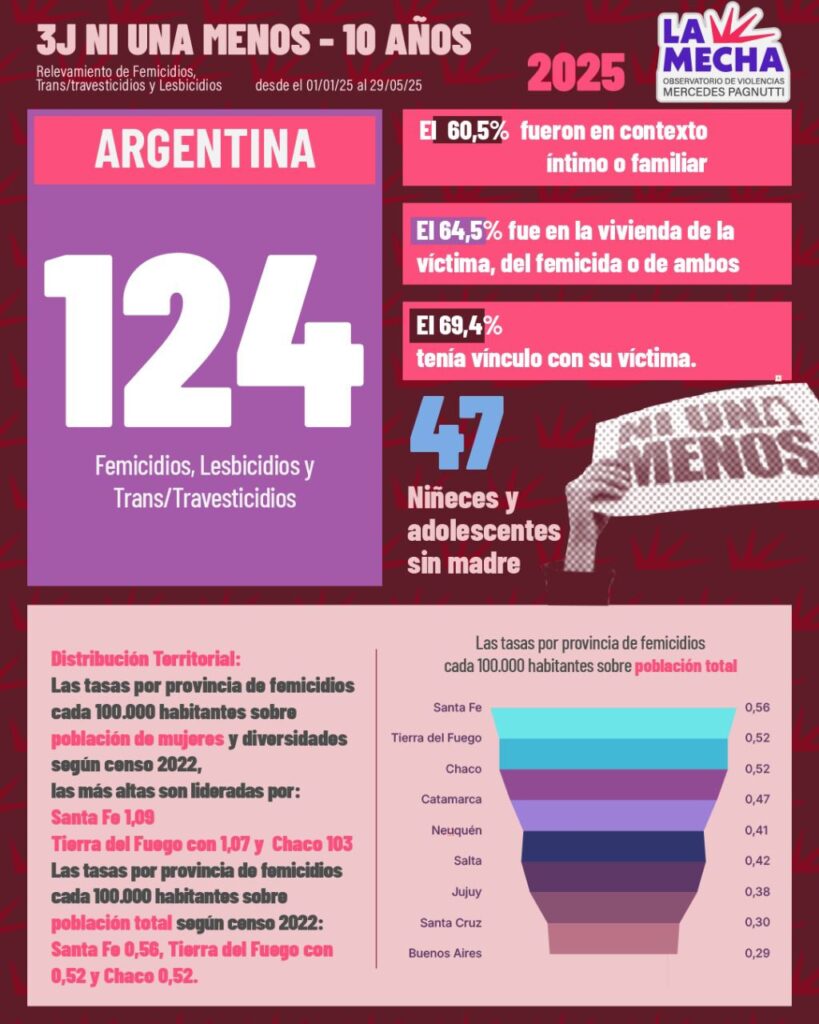 En lo que va del 2025, el Observatorio registró 124 femicidios, lesbicidios y travesticidios, de los cuales el 60,5% fueron cometidos por parejas, ex parejas o familiares, y el 64,5% ocurrieron en el hogar de las víctimas o en espacios compartidos, es decir, que el hogar es un territorio de riesgo. Esta violencia extrema no solo persiste: se reproduce de manera estructural en una sociedad marcada por la desigualdad, la impunidad y el abandono estatal.