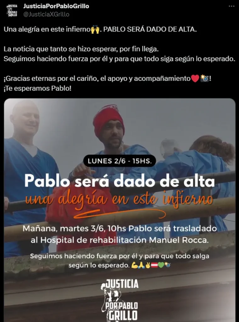La buena noticia fue confirmada por los familiares y amigos del fotógrafo a través de la cuenta «Justicia por Pablo Grillo». «Una alegría en este infierno. Pablo será dado de alta», escribieron en X.