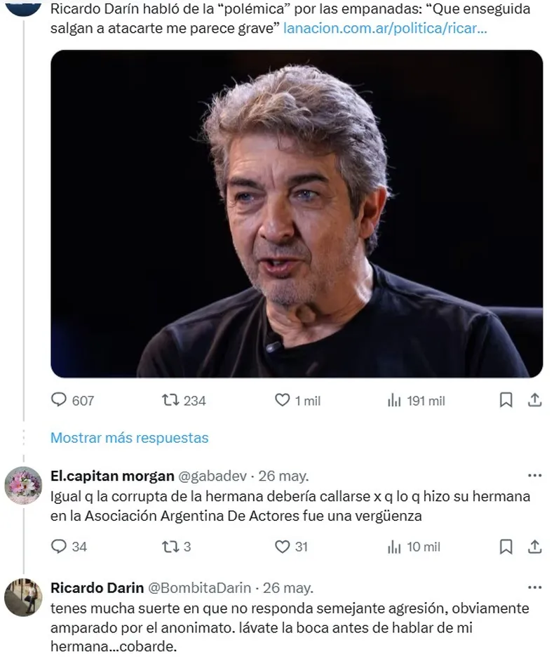 Todo comenzó a raíz de una serie de comentarios que tuvo la publicación del medio La Nación de una noticia donde hace mención a que el actor de El Eternauta, entre otras, “habló de la ‘polémica’ por las empanadas”. Sobre ese tuit, un usuario mencionó a Ricardo le dice que “llora porque le dicen que dijo una huevada”. “No seas tan trolo, Darín. Un comentario no es un ataque. Victimizarse es bien de kuka”, le escribió.